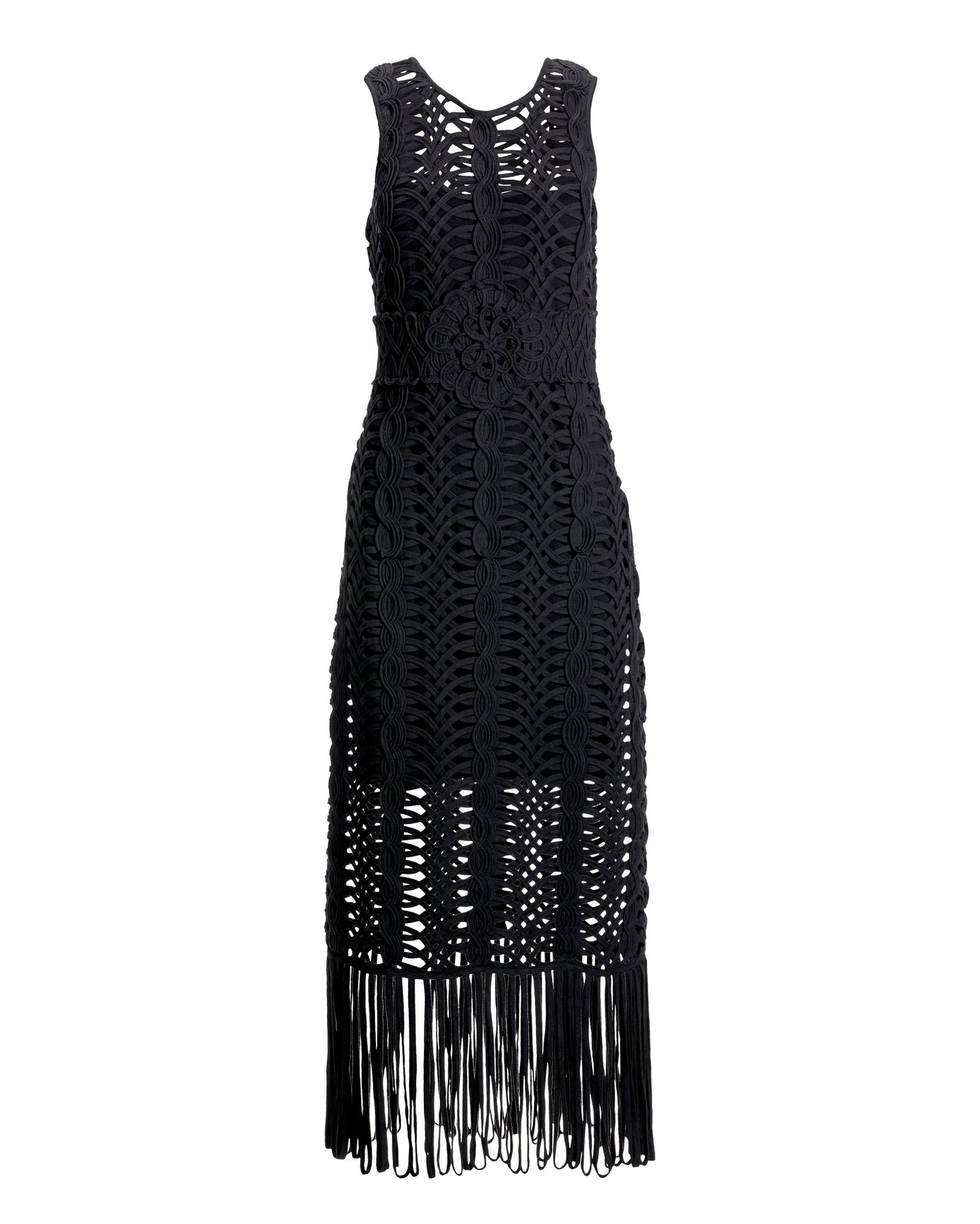 Little black sleeveless dress epitomizes luxe style with alluring macrame design finished with looped fringe hem that dances with every movement.