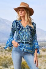 An exquisite paisley print and boho flare sleeve are eye-catching details we are enamored with. Its button-up design says style it for work while the comfortable. flowy silhouette goes casual.