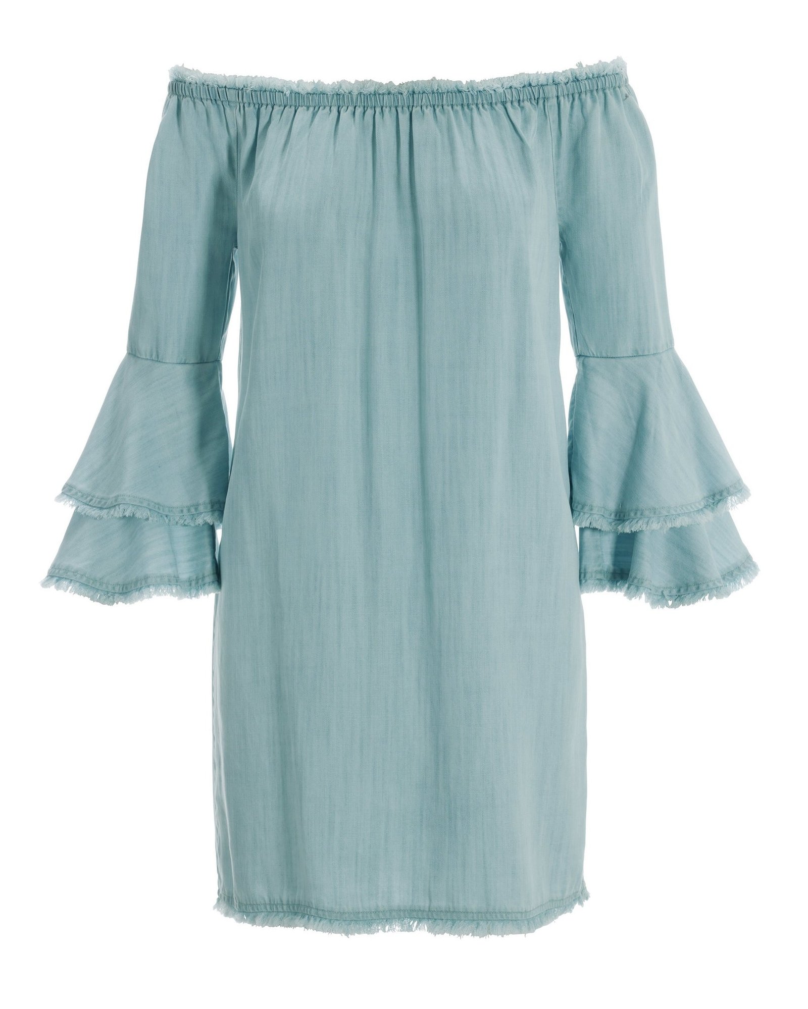 A flirty look with bohemian style. This off-the-shoulder chambray dress has a super-soft feel. tiered bell sleeves and a mini length. Detailed with frayed edges for an edgy accent. we love this effortless piece with ankle boots. embellished sandals or cork wedges.